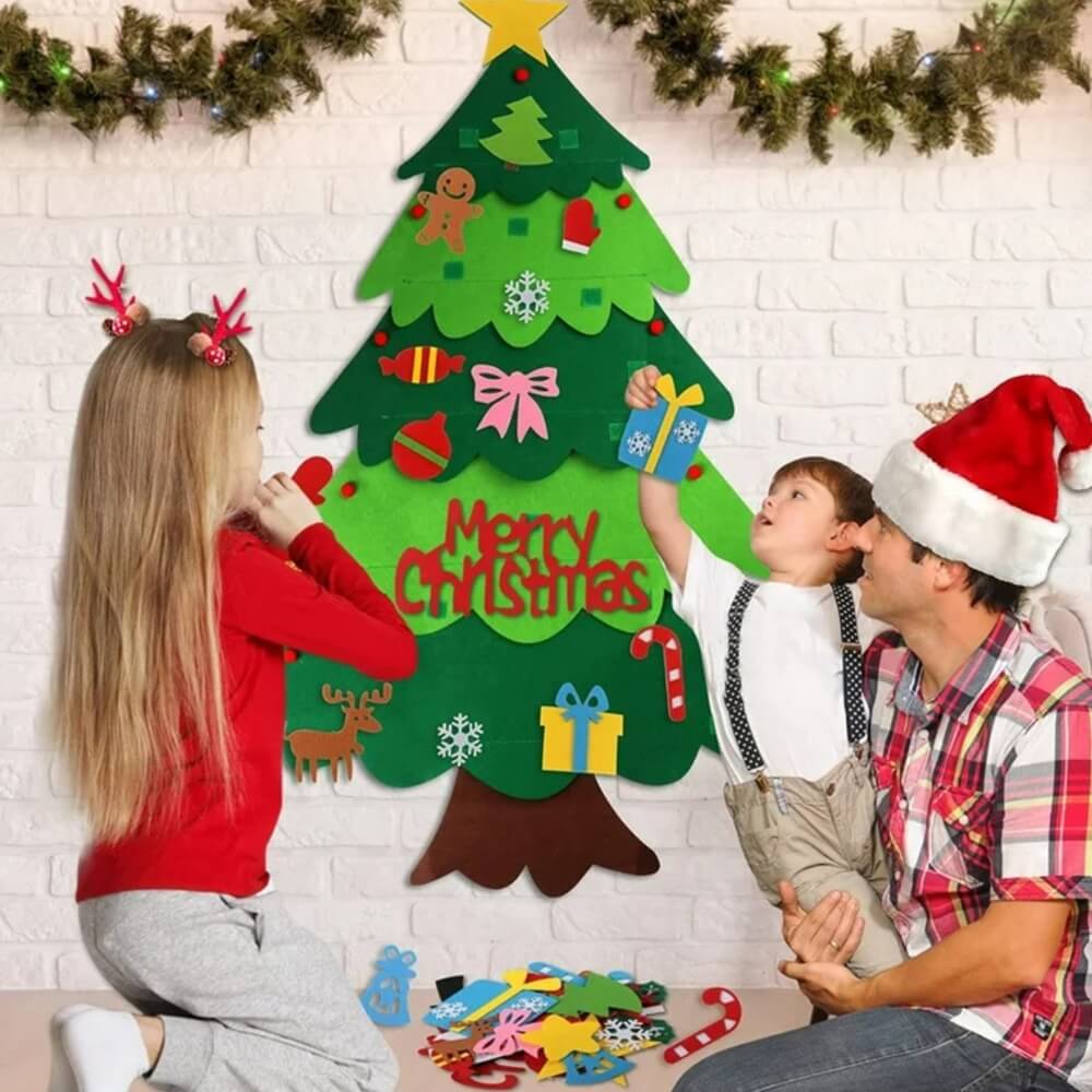 Vidste du, at traditionelle juletræer kan tabe tusindvis af nåle, hvilket skaber rod for børn? Juletræsæt i Filt er et sikkert og rod-frit filttræ, som børn kan dekorere og nyde – perfekt til en sjov og stressfri jul.