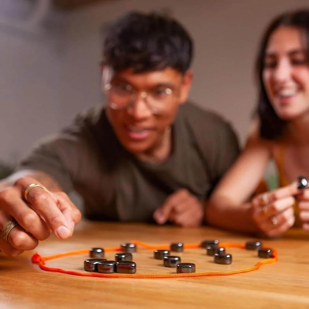 Klar til at tage dine spilaftener til næste niveau? I dette underholdende selskabsspil gælder det om at være den første til at slippe af med alle sine magneter. Spillerne skiftes til at placere magneter på spillefladen uden at lade dem tiltrække hinanden. Hvis magneterne kolliderer under din tur, skal du samle dem op igen – så planlæg dine træk omhyggeligt!